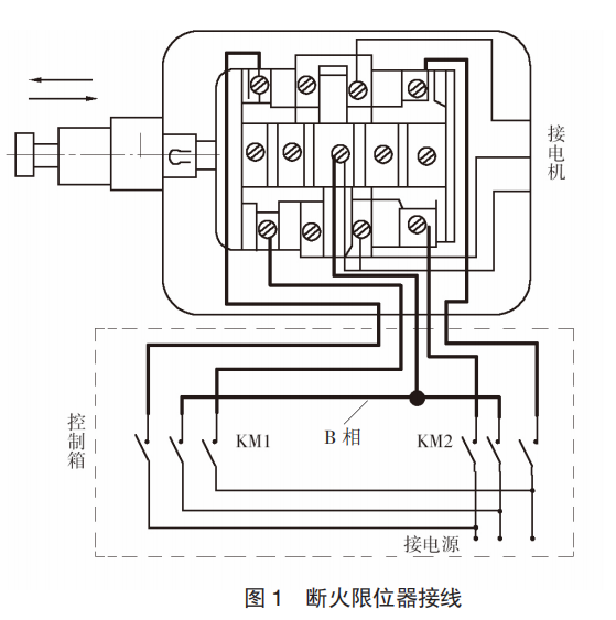 斷火限位器正確接線,共有 5 根線,B 相是公共線,靠近推桿一側(cè)的端子接上升接觸器的 AC 相,另一側(cè)接下降接觸器AC 相線,如果把這位置接反了,當(dāng)上升限位推桿碰觸斷火限位器時(shí),電動(dòng)葫蘆仍能上升但不能向下,相反當(dāng)下降限位推桿碰觸斷火限位器時(shí),電動(dòng)葫蘆仍能下降但不能向上(圖 1)。