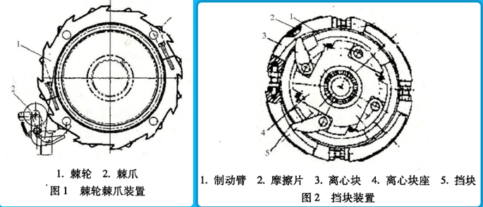 該類安全制動裝置也是裝于減速器低速級傳動末端卷筒的一端部,是一制動摩擦帶和附裝有離心塊擋塊裝置。制動摩擦帶纏于卷筒上,4塊棘輪通過高強螺釘壓緊制動摩擦帶,4個離心塊和擋塊均布固定在離心塊座上,位于卷筒內(nèi)。正常情況下離心塊和制動摩擦帶隨卷筒一同轉(zhuǎn)動,當(dāng)工作制動器失靈或傳動部件破斷,載荷快速下降使離心塊在離心力作用下打開,擋塊快速卡住離心塊使卷筒停住。因此,下落的重物被支持住實現(xiàn)制動。