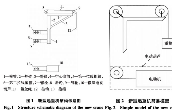 新型起重機是由三角架⑷、抱箍、滑輪、電動葫蘆、小型發(fā)電機等單位組成,整體結(jié)構(gòu)如圖1所示。架體是由橫臂、豎臂、斜臂、滑輪焊接成的三角架結(jié)構(gòu),套管與豎臂采用插接方式相連,滑輪分別設(shè)置在橫桿兩端,拉繩穿過滑輪固定在電動葫蘆上。吊裝設(shè)備時,可以通過控制器控制電動葫蘆裝置閔輕松吊起重量較大的設(shè)備,起吊設(shè)備不受地形限制,成本低廉,便于攜帶和安裝,起吊過程安全、平穩(wěn)、有序。