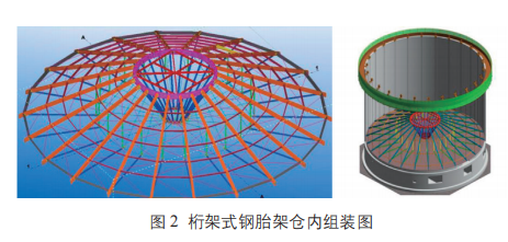 (2)鋼桁架倉內地面組裝。①將淺圓倉內地面回填并平整,便于地面組裝鋼胎模架。在倉內中心地坪上搭設長 6m× 寬 6m× 高 3m 的滿堂鋼管腳手架,在滿堂鋼管支撐架頂部滿鋪跳板組成上弦環(huán)梁安裝操作平臺。將上弦環(huán)梁在倉外平坦地面組裝好后,用塔吊吊至倉底預先搭好的滿堂鋼管支撐架上,在吊裝就位前按照預設的線將上弦環(huán)梁上螺栓孔對準筒倉壁牛腿預埋鋼板的中心。此外,照設計要求搭設26榀鋼桁架,用高強螺栓將 H 型鋼桁架鋼梁與上弦環(huán)梁連接成整體后,進行其他組件
