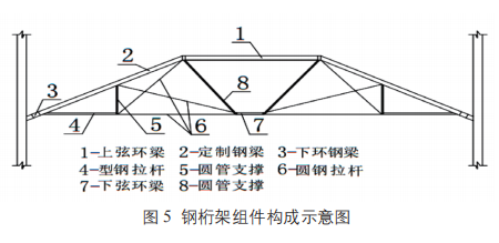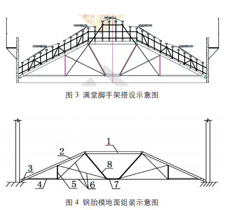 ② 鋼胎模整體安裝前,對專業(yè)分包隊伍進行安全技術交底,在淺圓倉筒倉內地面上按①→②→③→④→⑦→⑧→⑤→⑥組裝鋼桁架(見圖4)。