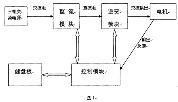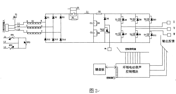如圖1、圖2所示,環(huán)鏈電動葫蘆智能控制器,包括整流模塊、逆變模塊和控制模塊,整流模塊和逆變模塊線路連接后分別與控制模塊線路連接,逆變模塊與環(huán)鏈葫電動蘆的電機線路連接,控制模塊與環(huán)鏈電動葫蘆的鍵盤板線路連接。
