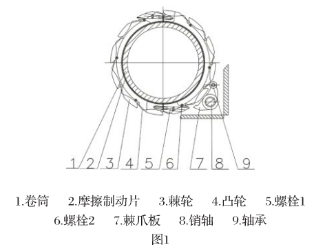 安全制動器的整體結(jié)構(gòu)如圖1所示。主要是一個棘輪機(jī)構(gòu)構(gòu)成,棘輪機(jī)構(gòu)由棘輪組件和棘爪組件組成,棘輪組件安裝在電動葫蘆的卷筒上,棘爪組件安裝在葫蘆外殼上。