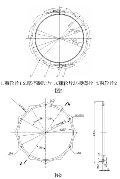棘輪組件主要包括兩塊棘輪片、摩擦片、凸輪、聯(lián)接螺栓。兩塊棘輪片是兩個半圓形,用聯(lián)接螺栓鏈接起來合成一個整棘輪,壓緊摩擦片緊固在卷同上,調(diào)節(jié)聯(lián)接螺栓的松緊,可以調(diào)節(jié)摩擦片制動摩擦阻力的大小。棘輪四周均勻分布12個輪槽和12個凸起,并均勻鉆有6個螺栓孔,用與凸輪聯(lián)接,如圖2所示。凸輪主要用來拔動棘爪上的軸承,其上均勻分布12個凸起,四周也均勻鉆有6個螺栓孔,用螺栓將凸輪緊固在棘輪片上并使凸輪的凸起與棘輪的輪槽保持適當(dāng)?shù)木嚯x,如圖3所示。