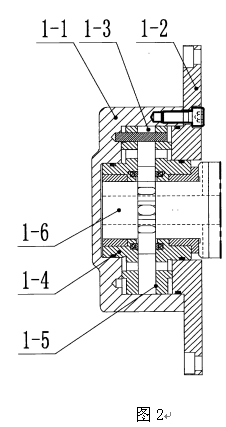 (2)如圖2所示,其中:非圓輪系液壓馬達1主要由殼體1-1、前端蓋1-2、非圓輪齒輪組1-3、上配流盤1-4、下配流盤1-5、軸1-6組成,該部分的主要功能是將壓力水、壓力油等液壓源的液壓能轉(zhuǎn)換成旋轉(zhuǎn)的機械能驅(qū)動手拉葫蘆進行工作。如圖5所示,所述非圓輪齒輪組由外齒圈1-3-1、轉(zhuǎn)子1-3-2及滾輪1-3-3組成,所述滾輪1-3-3設在內(nèi)部,轉(zhuǎn)子1-3-2設在滾輪1-3-3和外齒圈1-3-1中間,通過轉(zhuǎn)子1-3-2帶動滾輪1-3-3和外齒圈1-3-1轉(zhuǎn)動。