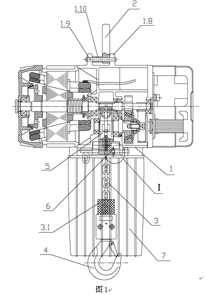 備注:圖中減速箱1、吊環(huán)2、鏈條3、吊鉤4、鏈輪5、限位裝置6、集鏈箱7、連接塊1.8、銷軸1.9、調(diào)整套1.10、緩沖擋塊3.1