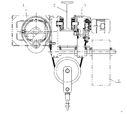 因為小車的墻板截面為框形結(jié)構(gòu),框形結(jié)構(gòu)的墻板可承載載荷大,框形結(jié)構(gòu)不易變形,調(diào)整螺栓所受的力也相應(yīng)變小,可采用比傳統(tǒng)鋼絲繩電動葫蘆更小的調(diào)整螺栓,使整個低凈空式鋼絲繩電動葫蘆自重更輕,材料成本也得到降低。