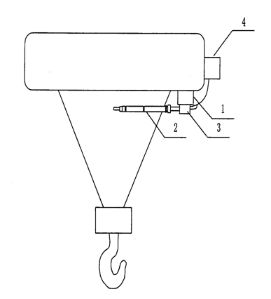 當(dāng)電動(dòng)葫蘆吊鉤懸掛的物體上升至開關(guān)探針的檢測范圍之內(nèi),開關(guān)探針就能檢測到物體的位置信息,所述報(bào)警檢測裝置2通過報(bào)警啟動(dòng)開關(guān)3與報(bào)警裝置4電連接起來,所述報(bào)警裝置4為聲音報(bào)警裝置或燈光報(bào)警裝置,當(dāng)開關(guān)探針檢測到物體的位置信息后,傳輸?shù)絾?dòng)開關(guān)3中,從而啟動(dòng)報(bào)警裝置4,報(bào)警裝置4通過聲音或燈光將信息傳輸給工作人員,以便于引起他們的注意,防止電動(dòng)葫蘆因過度上升而碰撞損壞,有效地保證電動(dòng)葫蘆的安全使用。