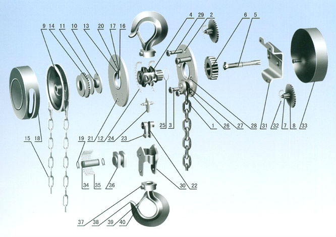 備注:圖中1起重鏈、2右墻板、3支撐桿、4起重鏈輪、5 為5齒長軸、6花鍵孔齒輪、7為4齒短軸、8片齒輪、9手鏈輪、10制動器座、11摩擦片、12滾柱、13軸承外圈、14棘輪、15手鏈條、16棘爪彈簧、17棘爪、18手鏈輪罩殼、19彈性擋圈、20棘爪銷、21、左墻板、22吊鏈板、23吊銷、24擋板、25彈性擋圈、26軸銷、27手輪、29、支撐桿、30下構(gòu)架、31外墻板、32滾柱、33罩殼、34游輪軸、35、滾桿、36游輪、38吊鉤、39止索夾、40無頭鉚釘。