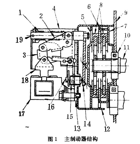 備注:1為壓力彈簧,2、3為連桿A、B,4為彈簧壓板,5/6/7為制動(dòng)盤A/B/C,8為制動(dòng)輪,9為機(jī)架,10為軸承,11為一級(jí)軸齒輪,12,13為制動(dòng)電磁鐵支架A、B,14為制動(dòng)器杠桿,15為調(diào)整螺釘,16為調(diào)整杠桿,17為固定鐵心,18為可動(dòng)鐵心,19為制動(dòng)桿。
