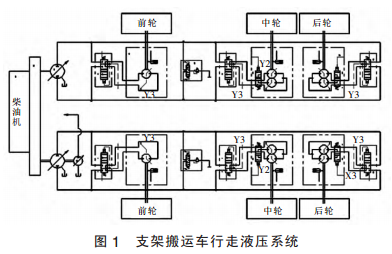 支架搬運車普遍采用液壓傳動的驅動方式,由于其載重量大,作業(yè)效率高、安全性高等特點,支架搬運車在井下搬家作業(yè)中使用越來越廣泛。其液壓系統(tǒng)主要由閉式行走系統(tǒng)、轉向系統(tǒng)、控制系統(tǒng)、制動系統(tǒng)、輔助系統(tǒng)和管路系統(tǒng)等部分組成。