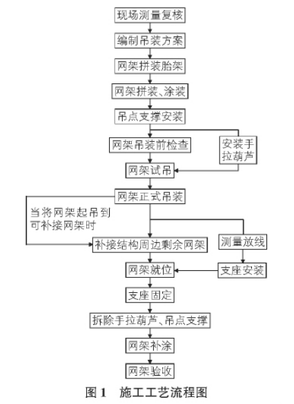 利用大起升高度手拉葫蘆作為吊裝起重設(shè)備。利用已完主體結(jié)構(gòu)柱或梁作為手拉葫蘆的系掛構(gòu)件。在網(wǎng)架吊點(diǎn)下部加設(shè)下吊撐,采用低位吊裝,可使網(wǎng)架的吊裝高度超過手拉葫蘆的系掛高度。將網(wǎng)架在主體結(jié)構(gòu)范圍內(nèi)進(jìn)行拼接組裝,網(wǎng)架拼裝的大小要能使網(wǎng)架順利的通過主體結(jié)構(gòu),吊裝到超過就位標(biāo)高后補(bǔ)拼網(wǎng)架側(cè)邊網(wǎng)絡(luò)構(gòu)件,補(bǔ)拼后再進(jìn)行網(wǎng)架就位固定。