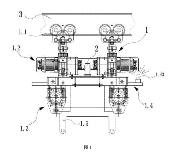 為解決單機(jī)晃動(dòng)的問題,凌鷹設(shè)計(jì)了一種雙主機(jī)雙鉤的冶金電動(dòng)葫蘆,包括兩個(gè)電動(dòng)葫蘆,兩個(gè)電動(dòng)葫蘆對(duì)稱設(shè)置在軌道上,兩個(gè)電動(dòng)葫蘆之間通過同步器相互連接,包括行走裝置、傳動(dòng)裝置和吊鉤裝置,行走裝置設(shè)置在軌道上,與傳動(dòng)裝置相互固定連接,傳動(dòng)裝置與吊鉤裝置之間設(shè)置有隔熱防護(hù)裝置。